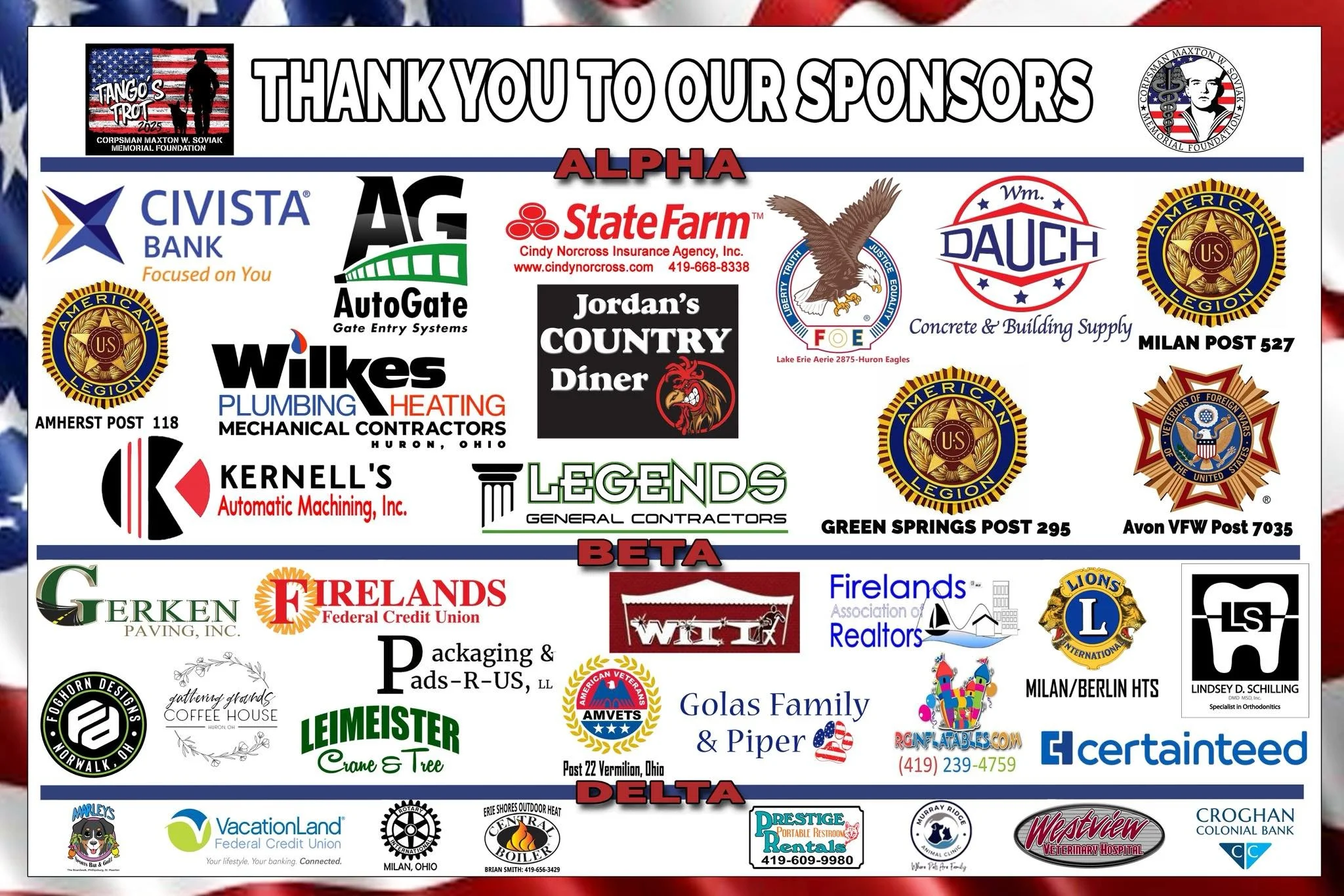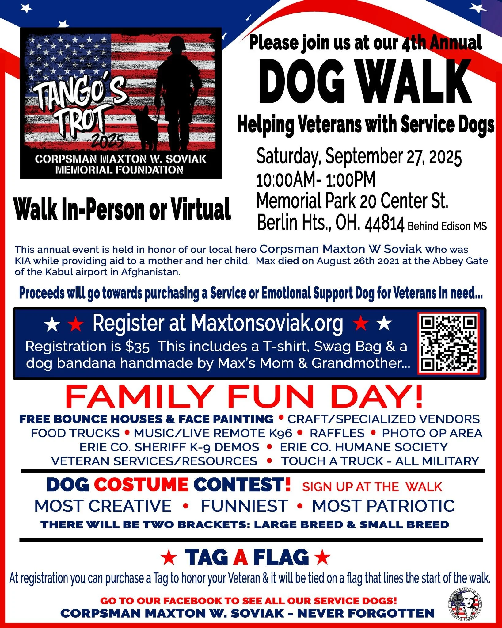 We are incredibly humbled by the generosity of our sponsors for the 2025 Tango’s Trot Dog Walk. Thanks to their continued support, we are able to carry on our mission of helping veterans Live Life to the MAX!